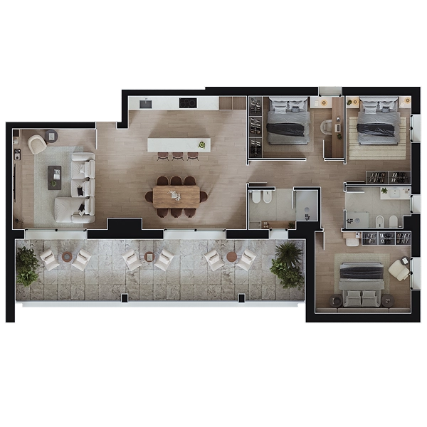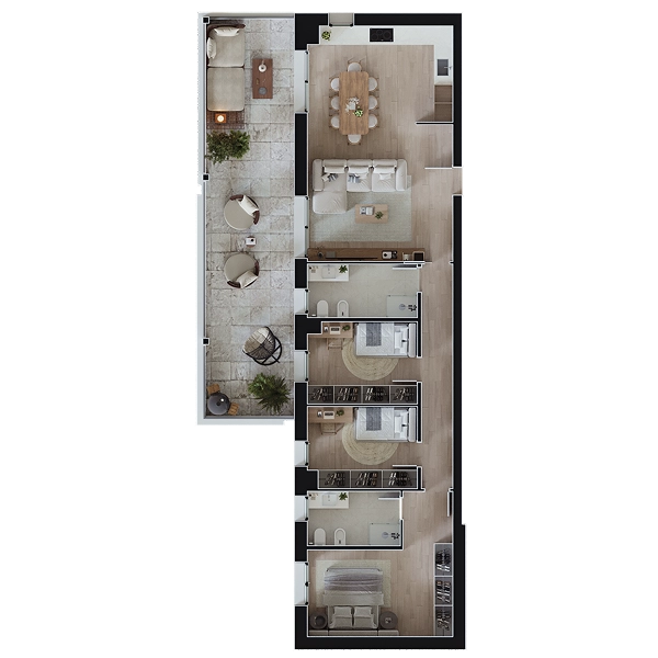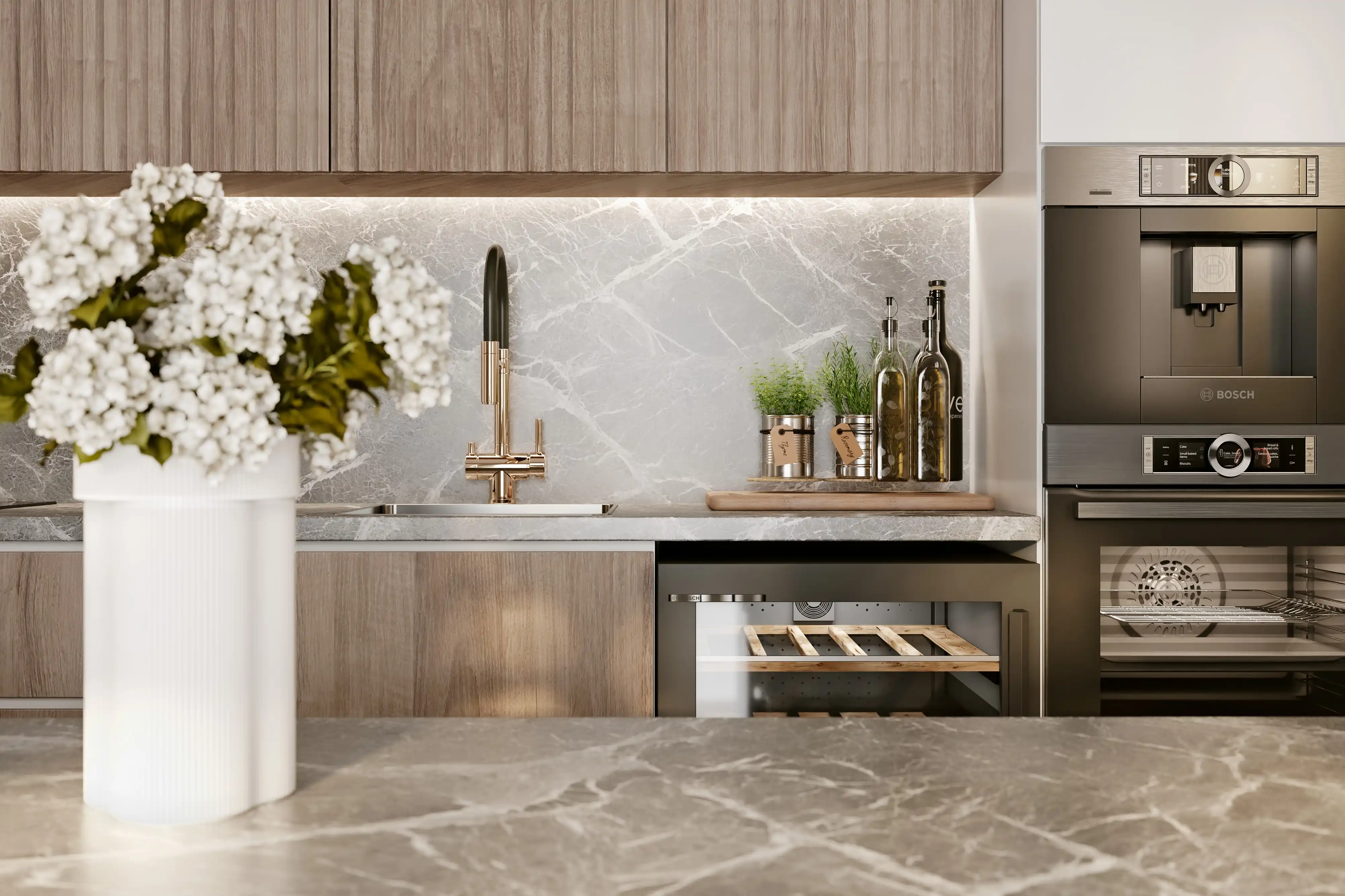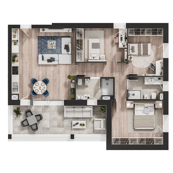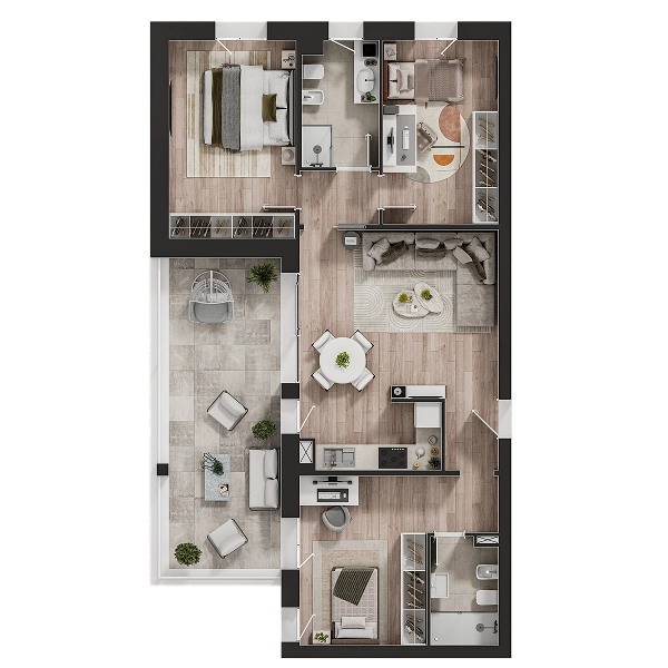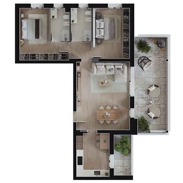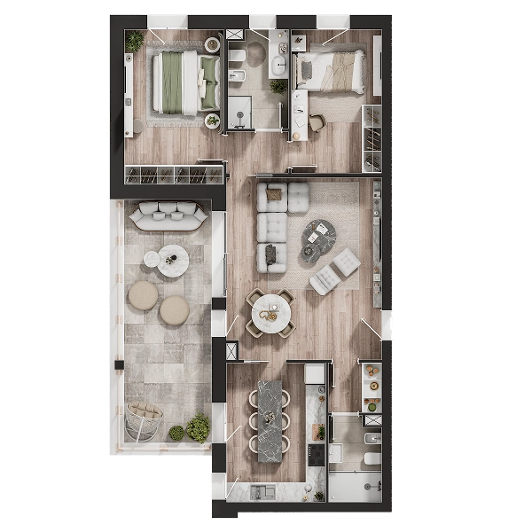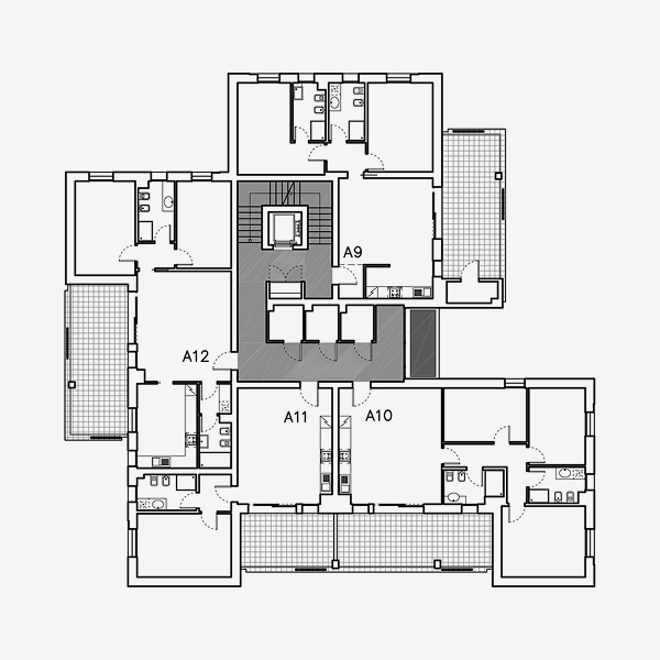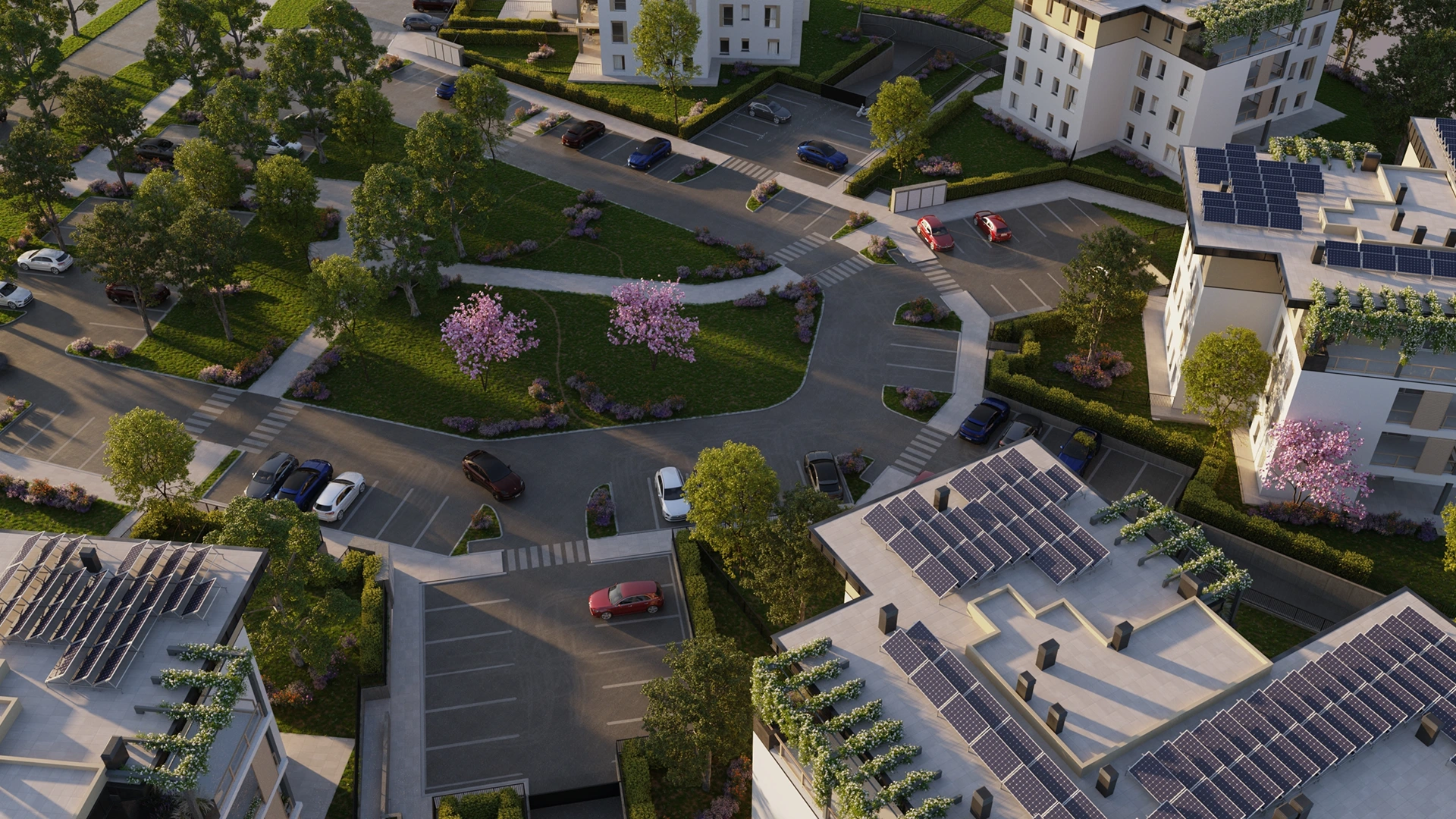 Gli appartamenti sono luminosi e curati nelle finiture, tutti dotati di ampi terrazzi che estendono la superficie abitabile verso l'esterno. Ogni unità dispone di un impianto fotovoltaico autonomo, riscaldamento a pavimento con cronotermostati per ogni ambiente e sistemi domotici in grado di gestire in modo intelligente le funzioni principali della casa. Al piano interrato si trovano i locali di servizio come garage, cantine e deposito biciclette, progettati con la stessa attenzione riservata agli ambienti residenziali per garantire ordine e praticità.