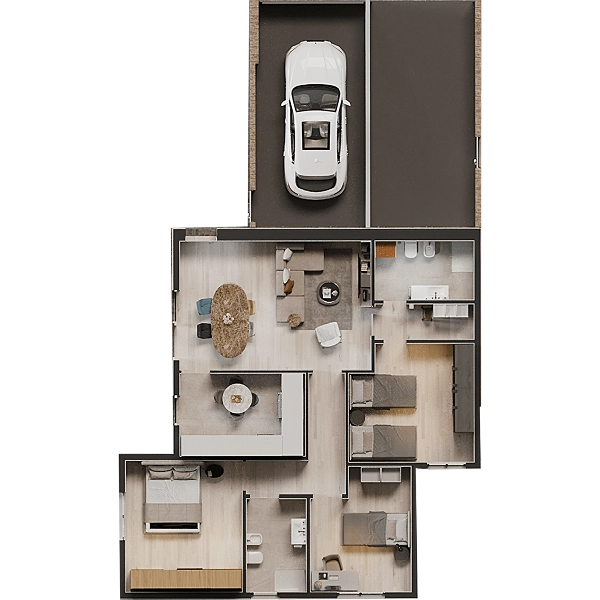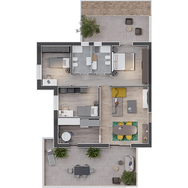 Tutti gli appartamenti sono composti da tre camere da letto, due bagni, soggiorno e cucina abitabile, e dispongono inoltre di garage privato e spazi di servizio. Gli spazi abitativi sono arricchiti da impianti moderni e soluzioni tecnologiche pensate per migliorare la qualità della vita dei residenti, come impianti fotovoltaici privati, riscaldamento a pavimento con cronotermostati indipendenti, sistemi di domotica ampliabili, infissi ad alte prestazioni e finiture di pregio. Il Quadrifoglio rappresenta la sintesi perfetta tra tranquillità, funzionalità e modernità: è un luogo ideale per coppie e famiglie che desiderano più di ogni altra cosa vivere nella quiete e a contatto con la natura.